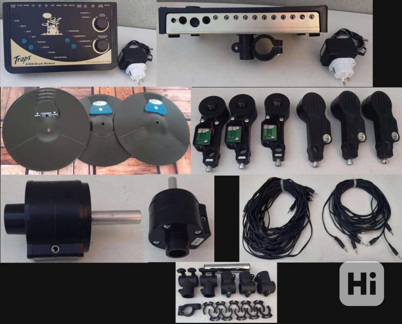 Bicí Modul TRAPS E408-Drum Module. Cena 599 Kč. - 1 ks. el. činelů TRAPS 1 ks. za 399 Kč. - 6 ks. snímačů TRAPS 1 ks. za 199 Kč. - Kabeláž s malými Jacky z 5ti kabelů za 249 Kč. - Kabeláž s malými Jacky z 8mi kabelů za 299 Kč. - 5 ks. plastových spojek na hrazdu. 1 ks. za 199 Kč. - 10 ks. příchytek kabelů k rampě. 1 ks. za 15 Kč. Chromovaná tyč k hrazdě za 149 Kč. Vše plně funkční. tel. 797 864 944 email:patmatvm@email.cz