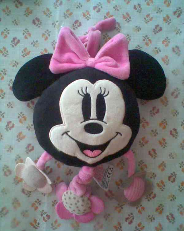 nová hrající Minnie, usínáček, povlečení do postýlky, metr na záznam jak dítě roste, lahvička se savičkou i s pítkem, nočník, textilní panenky a oblečení zdarma