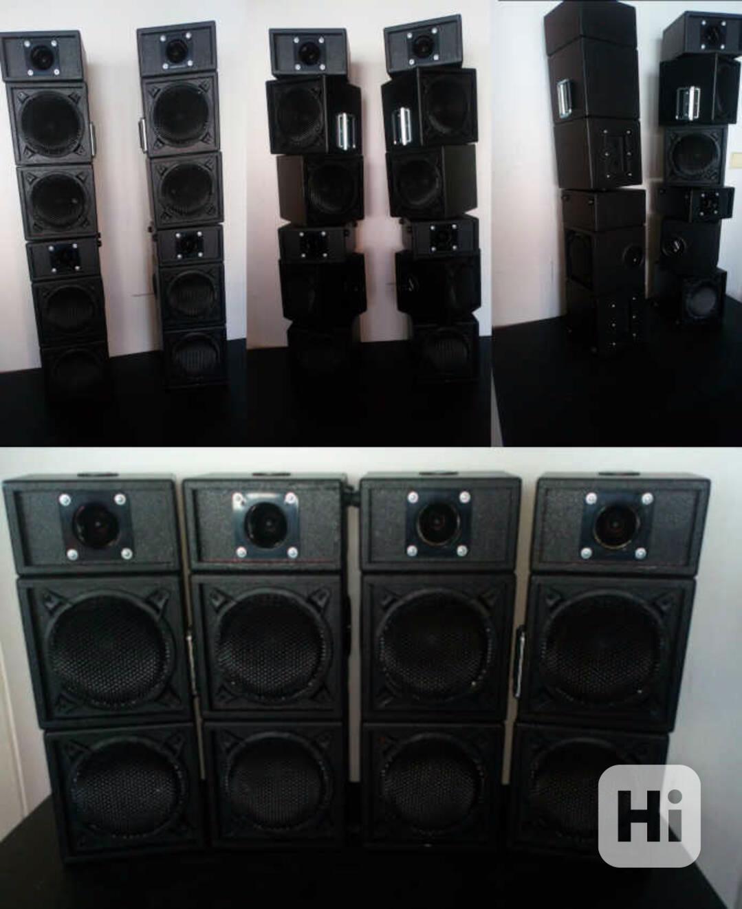 Reprobedny - 2 sloupky s 6 ks. (zakázková práce) + 2 držáky pro spojení 2 beden k sobě. Jeden sloupek je složený ze dvou beden s výškovým repro a 4 beden se středobasovým repro. Každá se dá otočit do jiného směru. Ve 2 bednách je otočný potenciometr na regulaci hlasitosti při jejich použití jako odposlech, kdy se bedna otočí místo dopředu do boku na kapelu. V každé bedně je zespodu (příruba „hnízdo“ pro tyč) Jedna sestava z 6ti beden (800 W/8ohm, v Peaku 1.200 W) se spojuje k sobě pomocí kulatého držáku. Výkon jedné bedny je 400 W/4 ohm. V Peaku 600 W. Frekvenční rozsah 100 Hz - 20 kHz. Citlivost pro výšk. repro. 100 dB, středobasu 95 dB. Použité repro. Thonsil GDWT 9/80 (160W sinus), středobasy BSA PL6 (150 W). Váha 1 bedny je 9,8 kg (Výšková 5 kg). Rozměry (6 beden) V = 107 cm, Š = 20,5 cm, Hl. = 20,5 cm. Povrch nástřik napařené hmoty v barvě imitace černé koženky. Cena za vše 13.499 Kč. tel: 797 864 944 email:patmatvm@email.cz